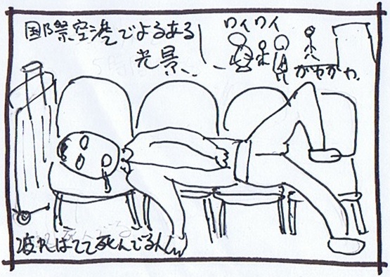AM12:20 成田に向けて離陸。液晶モニタ付きの座席に感動。スピード2としこふんじゃった見て後はゲーム。周りの人は私の今の状況とか知らないのでさぞかし異様なテンションが不気味だったと思う。髭・髪ボーボーで顔は日焼けで真っ黒。で、泣き笑いしながらゲームに興じる。ちょっと頭のおかしな人っぽかったと思われる。