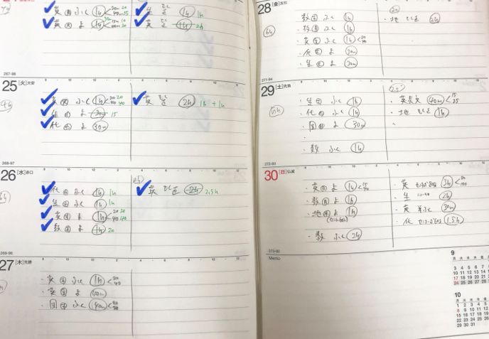 日々の行動を15分刻みで記録し、また自分で問題演習を行う時間も以前から格段に増やしていくことができるようになりました。
