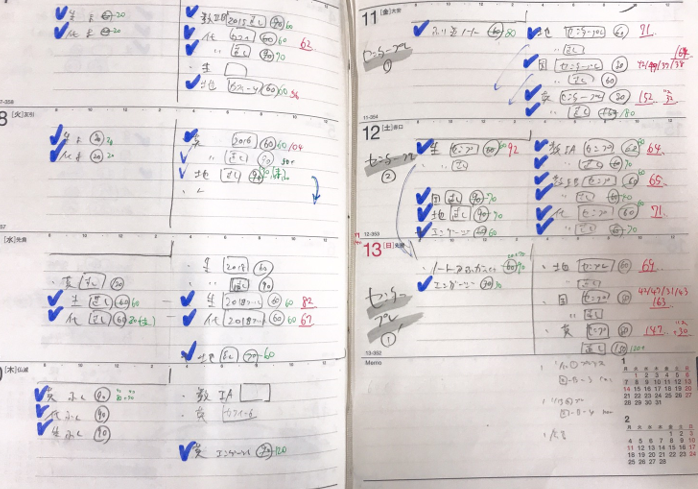 2つ目に、週ごとの学習計画を作り、それに自分の行動記録を綿密に記していくよう指導していきました。先の時間への意識とも絡め、毎日必ずその日の振り返りをして、どのように時間を使っていたかを記録すること。そして自分が週ごとの目標をどれだけ達成しているか、目を背けず必ず振り返ること。そうしたことを日々繰り返しながら、毎回の指導で必ず前週の振り返りと次週の計画作り・目標作りを一緒に行っていきました。