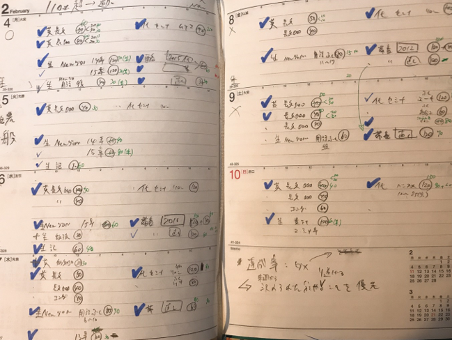 (2月上旬の週計画。二次試験本番に向け、気合の入れ方が以前と段違いに。〇印の予想時間に、10分単位で実際の所要時間を緑色で逐一記録。時間の使い方への意識が別人のように上がってきました)