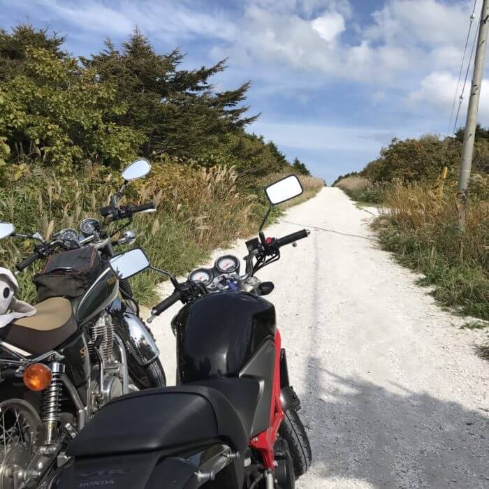 手前のハザードランプが黄色く光っているのが愛車「SR400」
